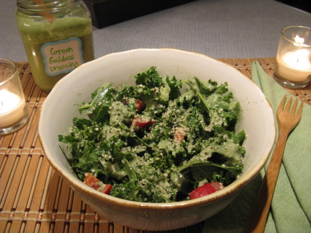 And to end the day on a green note, some organic collard wraps stuffed with raw falafel, veggies and lemon-tahini sauce. Plus, another kale salad smothered in my favorite Green Goddess Dressing (recipe by Gena Hamshaw).