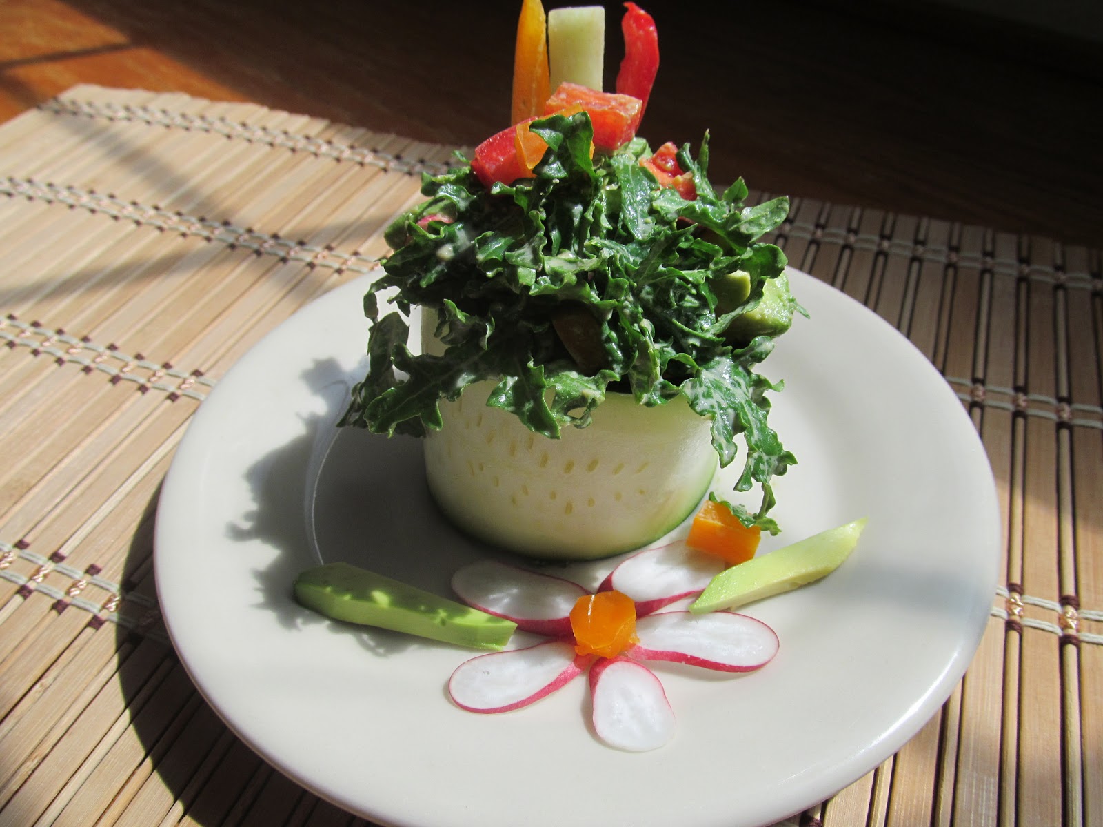 And for lunch…I feel a little artsy. My favorite raw kale salad sportin’ some new style! Inspired by my weekly box of organic produce and the beautifully presented recipes by Kris Karr and chef Chad Sarno in their book Crazy Sexy Kitchen.