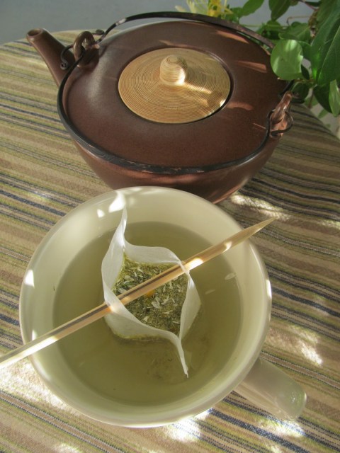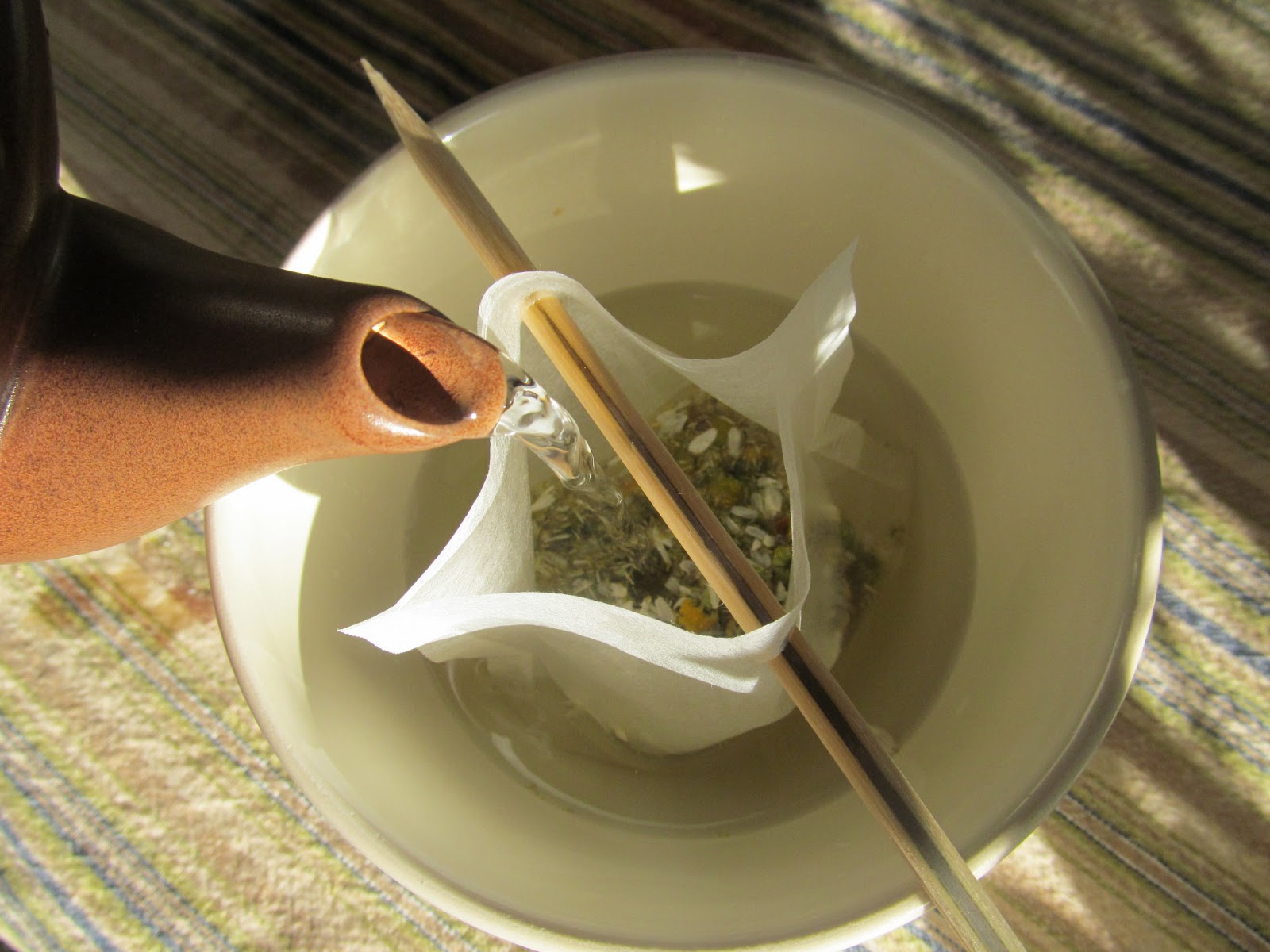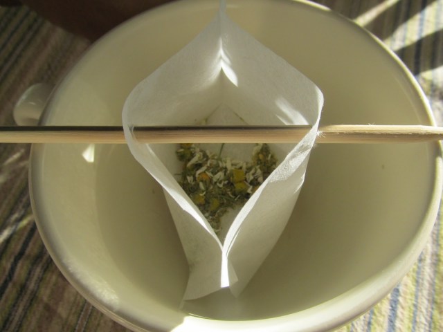 I purchased some tea bags, scrounged up some short bamboo skewers and chose a teapot from the collection. Homemade tea calls for a special-occasion teapot! There was something so satisfying about the simple act of pouring hot water over those organic dried chamomile flowers…my little moment of solace.