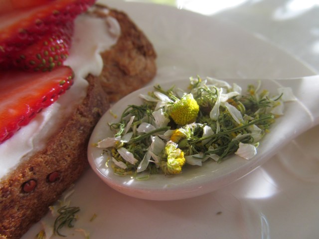 Since I had a batch of freshly dried organic chamomile flowers and a bowl of scrumptious looking strawberries, I thought I’d explore this new flavor combination in a smoothie.