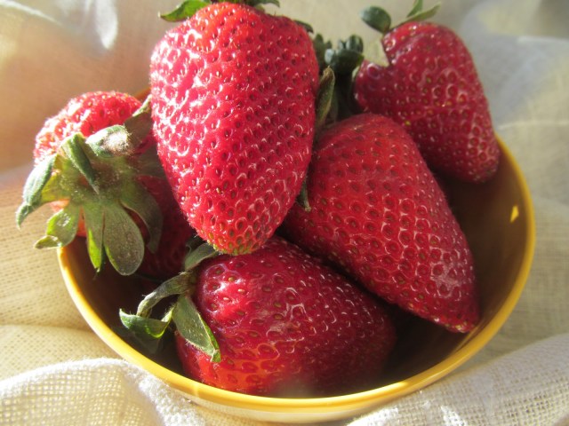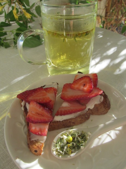 I needed my strawberries frozen and my chamomile tea chilled, so I washed and sliced the berries for freezing setting aside a scrumptious few for breakfast. Then I brewed myself some extra chamomile tea, some to chill for a smoothie and a cup to sip with my morning berries. It was such a lovely morning and it won’t be long before it’s too hot to enjoy an early morning cup of tea unless it’s on ice. So, I sat on the patio with my crazy chamomile and my scrumptious strawberries on gluten-free toast with vegan cream cheese.