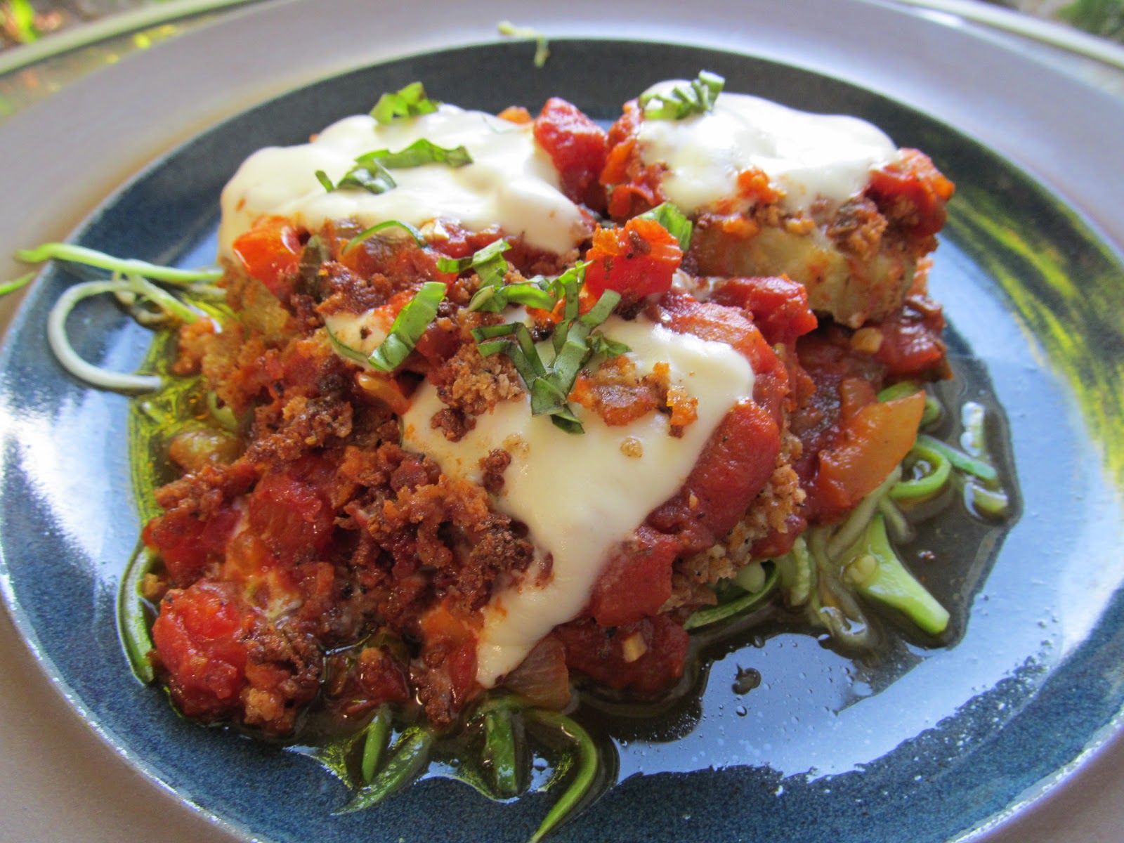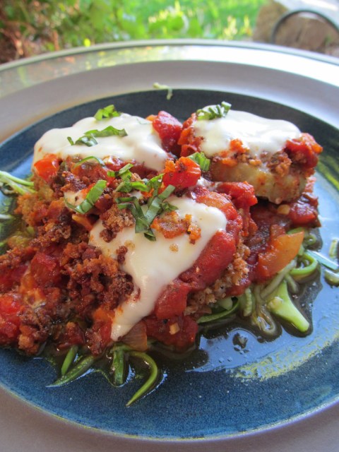 After my eggplant was all sweaty, I rinsed the rounds, gently dried them then dunked and dredged them. First, a coating of batter then, a covering of crumbs and finally into a heated pan with a bit of hot coconut oil to fry them up. While the eggplant was sizzling (don’t forget to flip ’em!) I prepared the plates with a serving of zucchini pasta smothered with fresh marinara sauce. And when my eggplant was nice and crispy I topped them each with a spoonful of marinara and a slice of vegan “provolone style” cheese. And finally, I settled my dressed-up eggplant on top of a bed of zucchini noodles and paused to admire my latest creation. And it was so pretty, I couldn’t resist posing my pretty plate for a picture :)