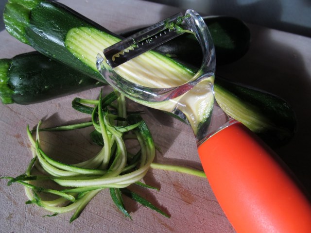 I could have used gluten-free pasta, but I opted to use zucchini “noodles” instead. I do not have a spiralizer, but I recently found this nifty gadget at the grocery store. It works pretty well for making thin noodles out of raw veggies. Or, if I want a little more substance to my veggie pasta, I simply use a carrot peeler to make a wider noodle. Either way, raw zucchini or yellow squash pasta is great for a cool and light summer meal. This night my noodles were not quite raw, for I sauteed them slightly, keeping them light and fresh with a bit of crisp still intact.