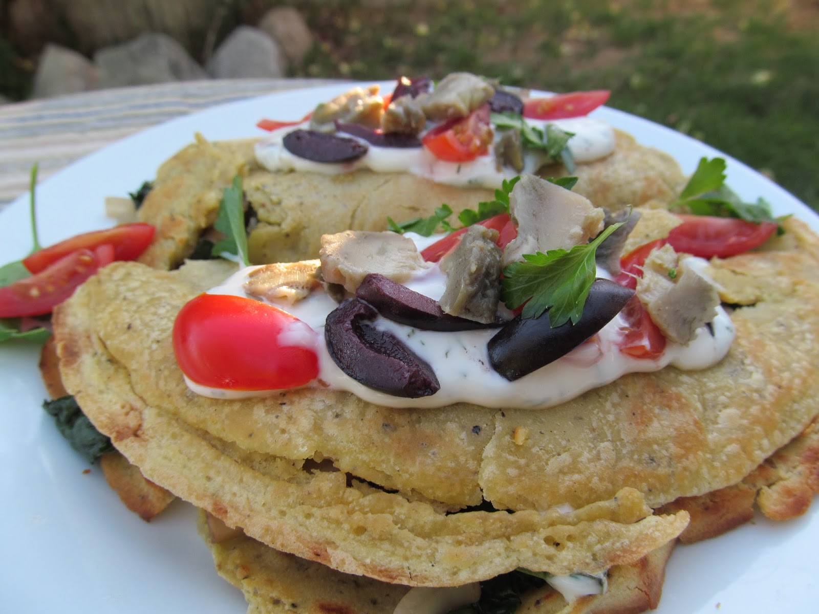 Instead of using the mushroom filling from the book, I stuffed my crepes with some simple veggies (zucchini, red bell pepper, red onion, kale and mushrooms) sauteed in a little coconut oil and garlic. I topped them off with a generous dollop of aioli, some chopped cherry tomatoes, kalamata olives and a few more artichoke hearts. New favorite meal. Simply delicious!
