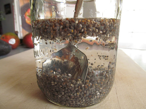 First, I put about one tablespoon of chia seeds in a cup of water and set it in the fridge to “gel up” for about 20 minutes. Chia seeds absorb liquid, creating a layer of gel around each tiny seed. They tend to clump together in water, so be sure to stir them once or twice while they soak.
