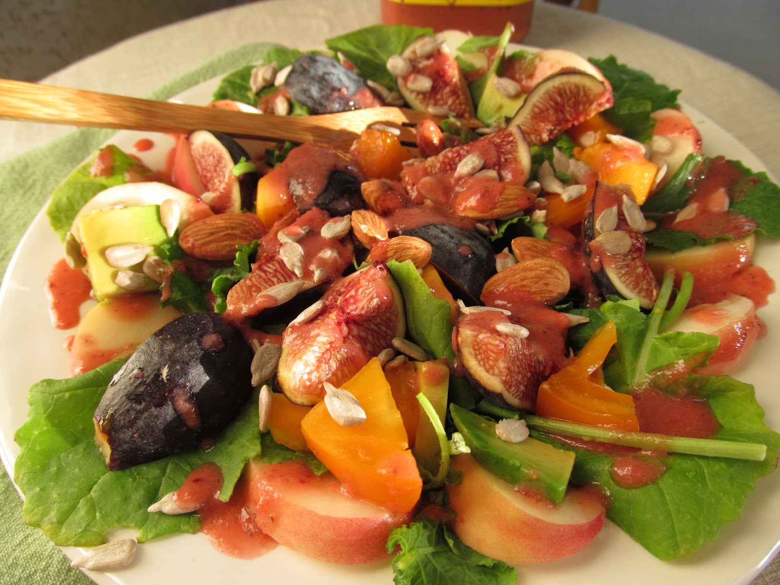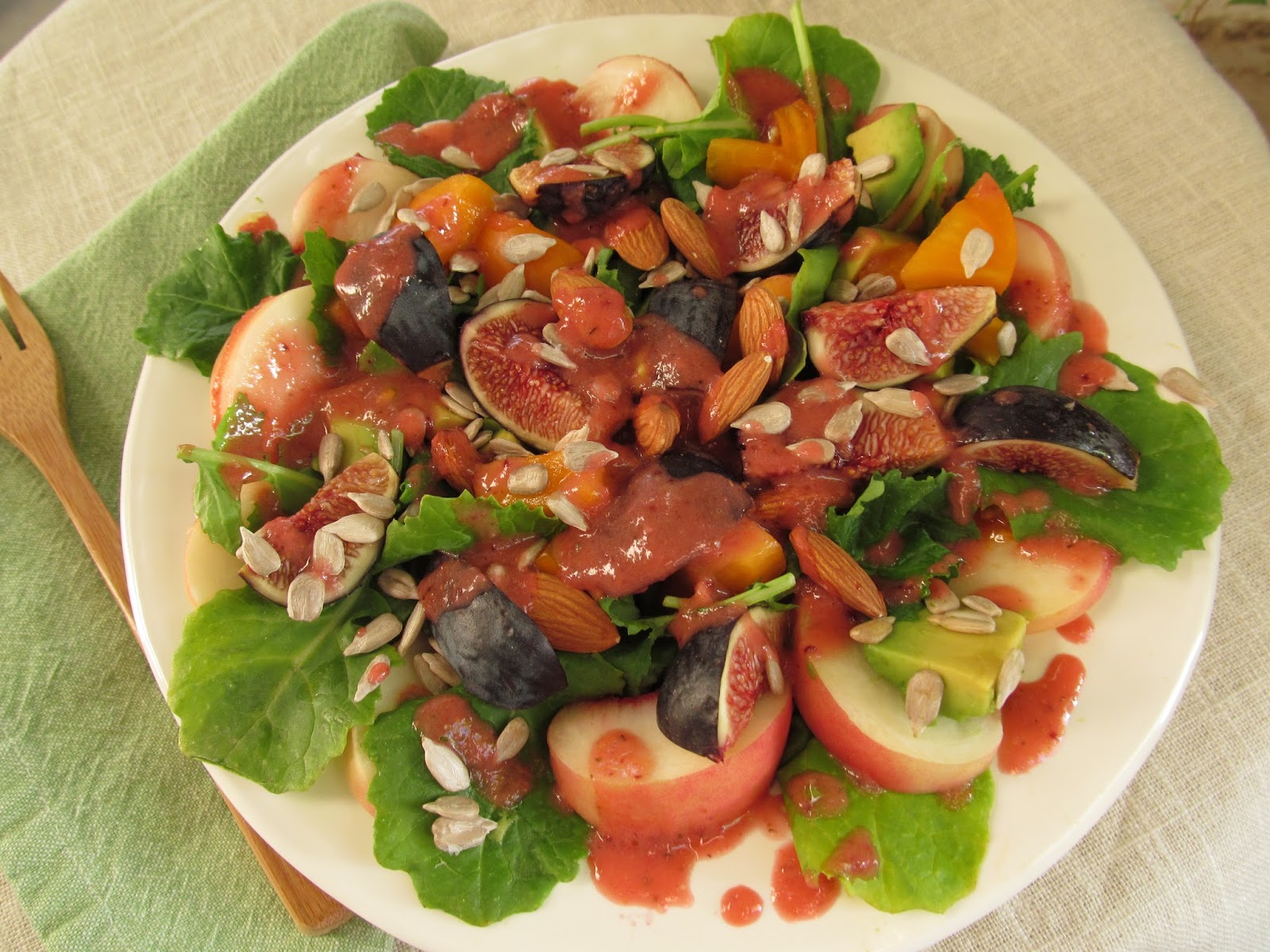 Nearing summer’s end, the refrigerator is still loaded with organic stone fruits searching for a purpose. That was my inspiration for this kale salad loaded with white cling peaches, avocado, figs, tomato, sunflower seeds and almonds. Packed with protein and drizzled with this fruity vinaigrette, it was light and sweet, yet substantial enough call itself a meal.