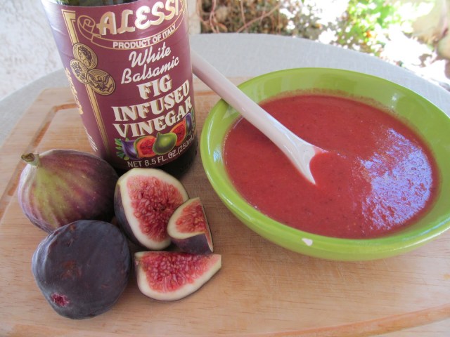 Now, thinking of dinner and something new for my lunchbox, I envisioned salad dressing…vinaigrette, perhaps, made with my pretty pink summer figs. In a serendipitous moment, I discovered a recently purchased bottle of fig-infused white balsamic vinegar stashed away and forgotten in the cupboard. Well then, Fig Balsamic Vinaigrette, it is.