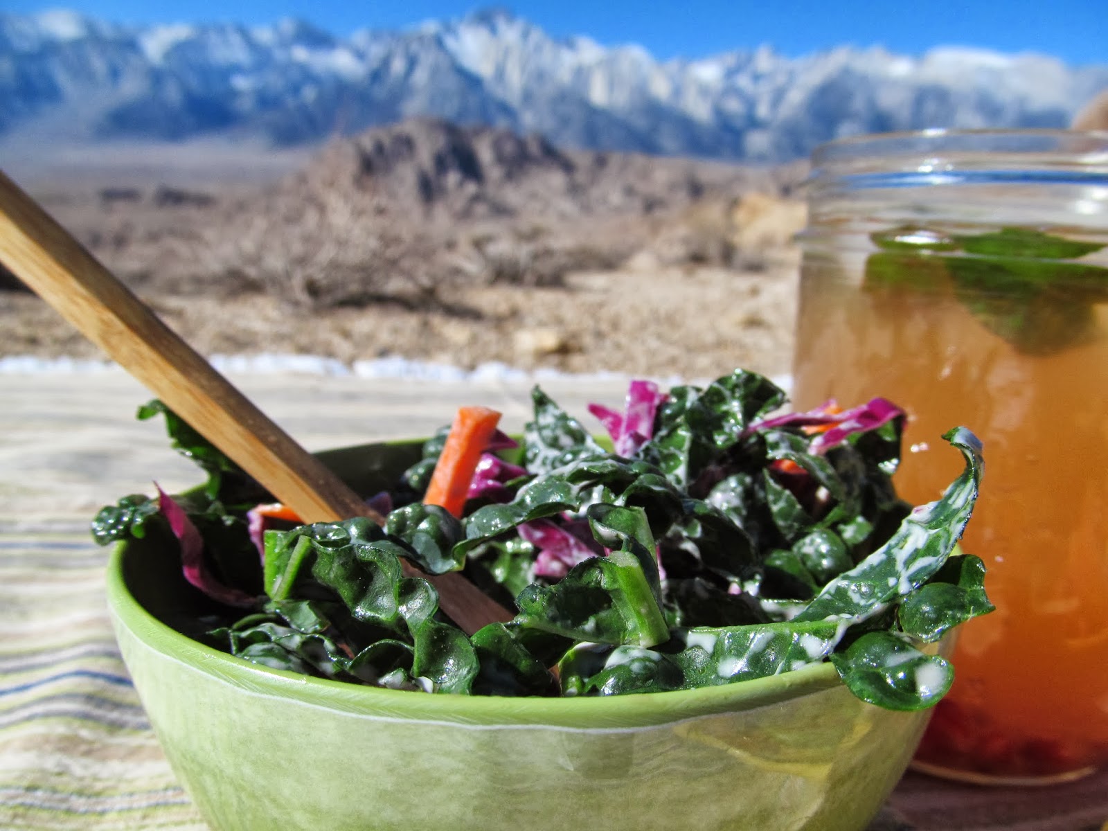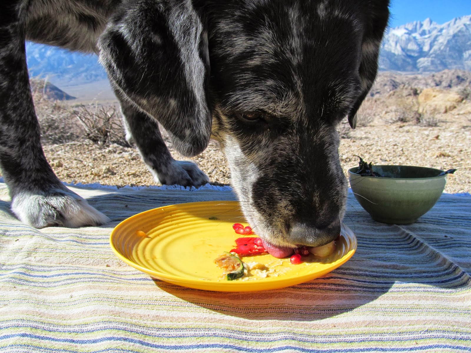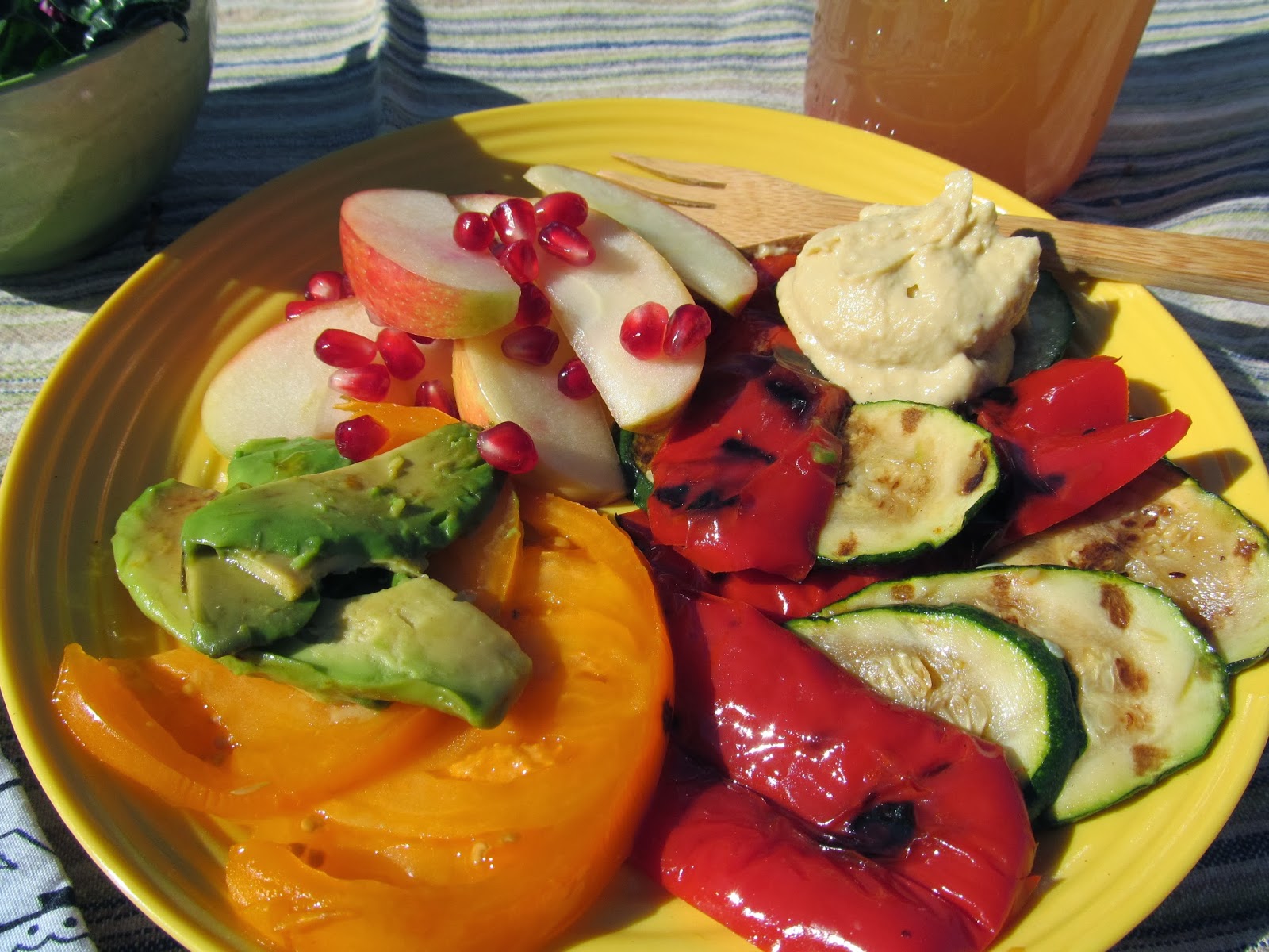 The mutts and I parked near the main road and walked up to the saddle, thoroughly enjoying the movement and the moment. At the saddle, we settled in, unpacked the picnic and puttered about. I had planned on building a sandwich of grilled veggies and hummus on gluten-free bread. But since I, unintentionally, left the bread in the car, I fixed myself a plate of grilled veggies with hummus, sans bread. Throwing in some heirloom tomatoes and avacado with a side of vegan kale and red cabbage coleslaw…it was beautiful, simple, pure and delicious. Oh. And don’t forget the honeycrisp apples and pomegranate for dessert. And the homemade pomegranate-camu lemonade. What can I say? It was a perfect picnic.