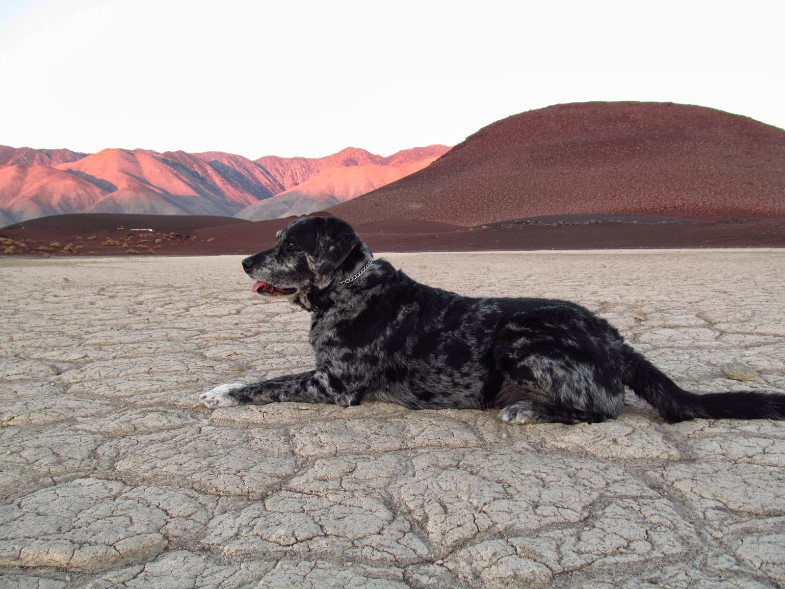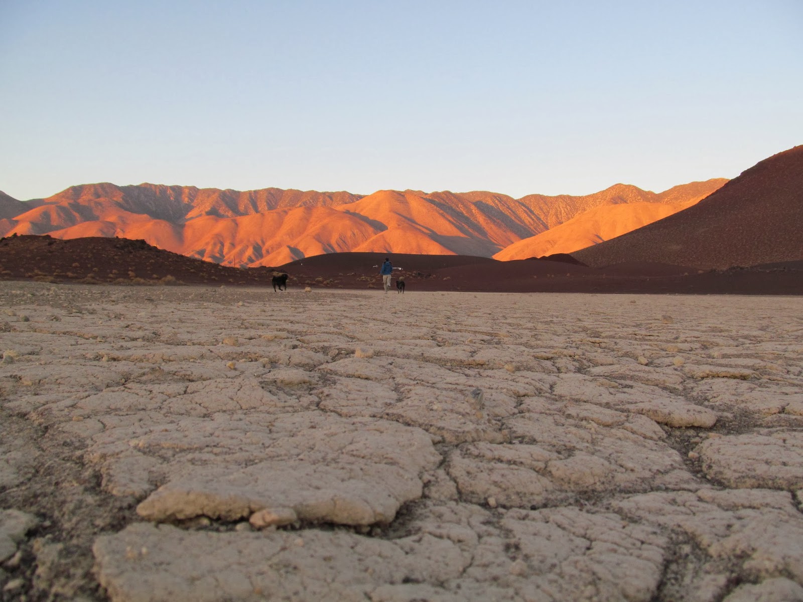 The pups were beyond restless, beside themselves with the anticipation of this unexpected adventure and not about to tolerate a lengthy car ride. I stopped near Fossil Falls to let them run in the open space of a dry lake bed. And run they did, with such joy and glee and bounding energy! They were so happy to be out and about in this rosy hour…I must say, it was quite contagious. In the midst of their frantic fun frenzies, those dogs of mine never fail to pause and take it in with a seemingly peaceful, grateful heart. I adore it.