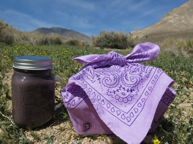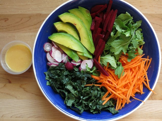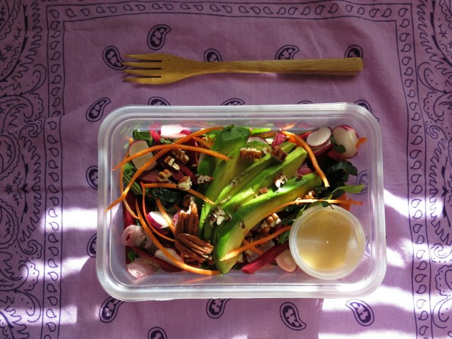 After a lazy start to my midweek morning, I gathered together some odds and ends from the fridge and packed myself a little picnic lunch. With some fresh veggies left from last week’s produce box and a bit of leftover miso-citrus dressing from the night before, I made a bright and cheery spring salad to go. I wrapped it up along with the last of the homemade hemp hummus, some crackers and a blueberry-acai smoothie from the freezer for dessert.