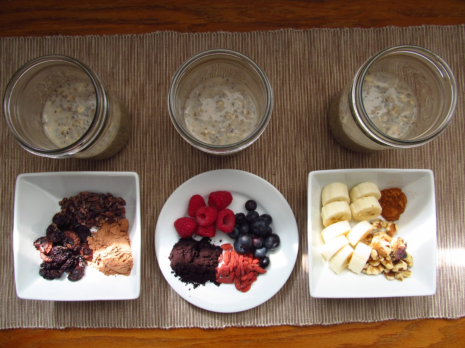 First, I tripled the basic recipe (though I used a tad less milk to make mine a little thicker) and divided it up into three jars. Then, I chose three different flavors to play with: superberry, banana-walnut and chocolate-cherry.