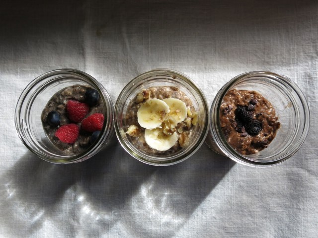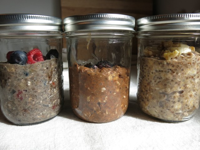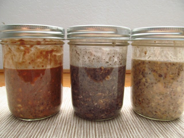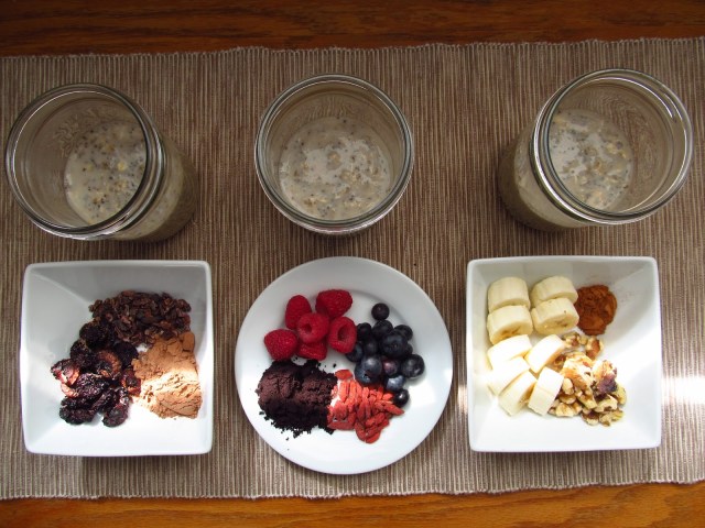 After mixing my add-ins and oatmeal base, I sealed them up and set them in the fridge for tomorrow’s traveling breakfast…and the next day’s…and the next. After an overnighter in the fridge, they were all dressed and ready to go. That’s all there is to it. A little forethought and a few minutes of time and you have yourself three days of healthy morning meals all packed up and ready for that mad morning grab.