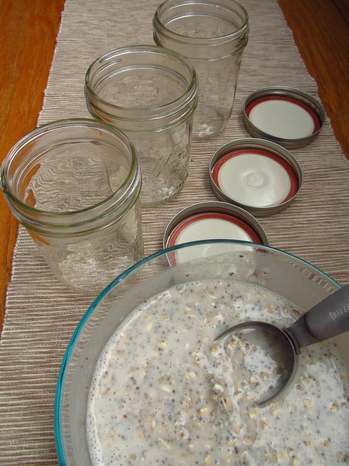 Then it is suddenly time for work and my pace changes considerably as I run about in a not-so-organized way, grabbing this, fetching that, throwing it all in the work bag, hoping nothing spills, leaks or scatters about. Lately, I have been trying to be sure to include some sort of healthy breakfast in my frantic morning swoops. And this is where, I have found, a jar of breakfast comes in very handy.
