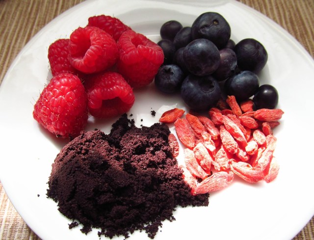 Superberry: 1 tablespoon acai powder, 2 tablespoons dried goji berries, a small handful of fresh blueberries and raspberries