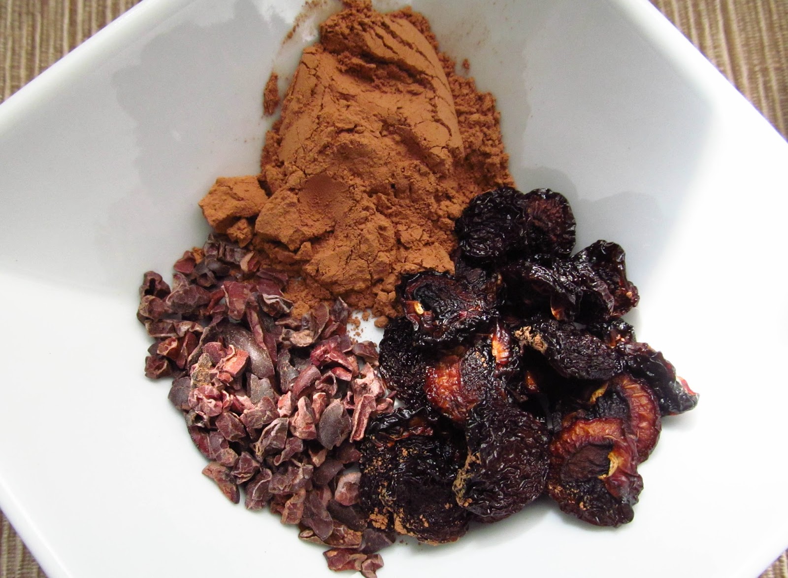 Chocolate-Cherry: 2 tablespoons dried cherries, 1 1/2 teaspoons cacao powder, 1 1/2 teaspoons raw cacao nibs