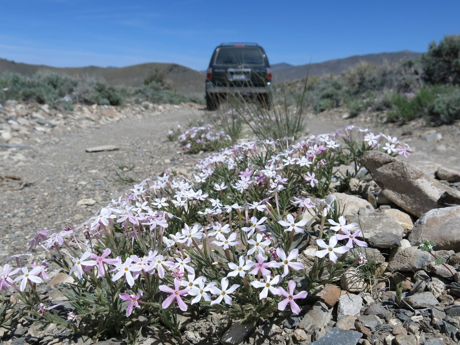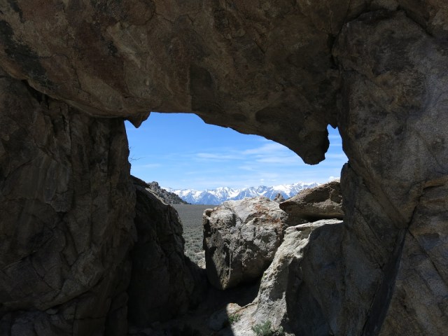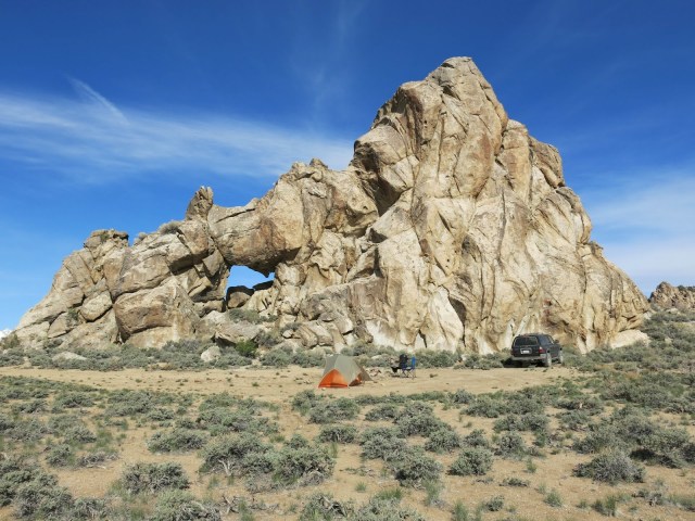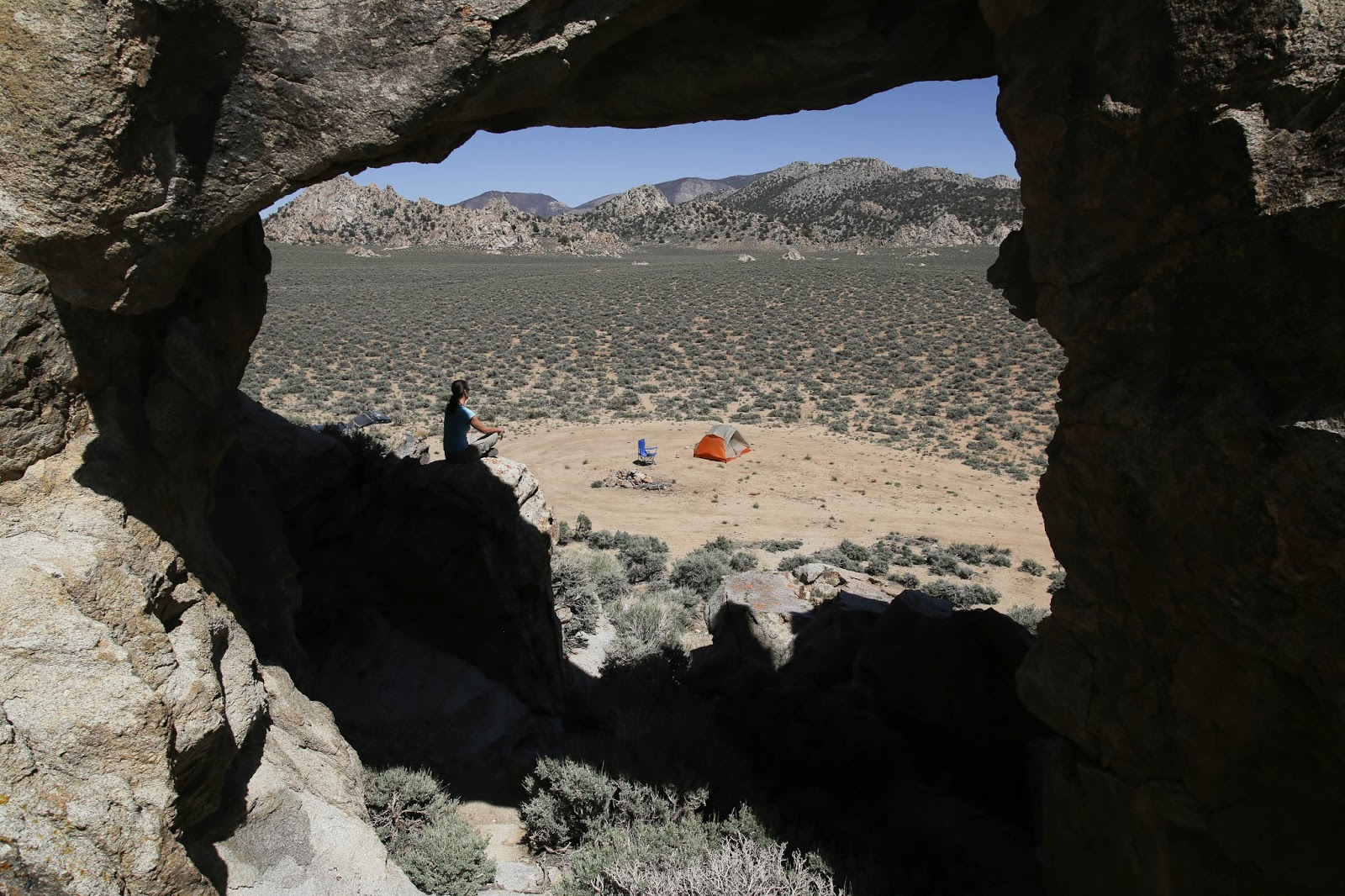 The road in wasn’t exactly an easy ride, but it sure was pretty to look at with bunches of wildflowers paving the way. It was a clear and beautiful day and we found ourselves the most perfect campsite next to a very picturesque rock formation. Our campsite accommodations even included a window with a view of the snow-capped Sierra off in the distance.