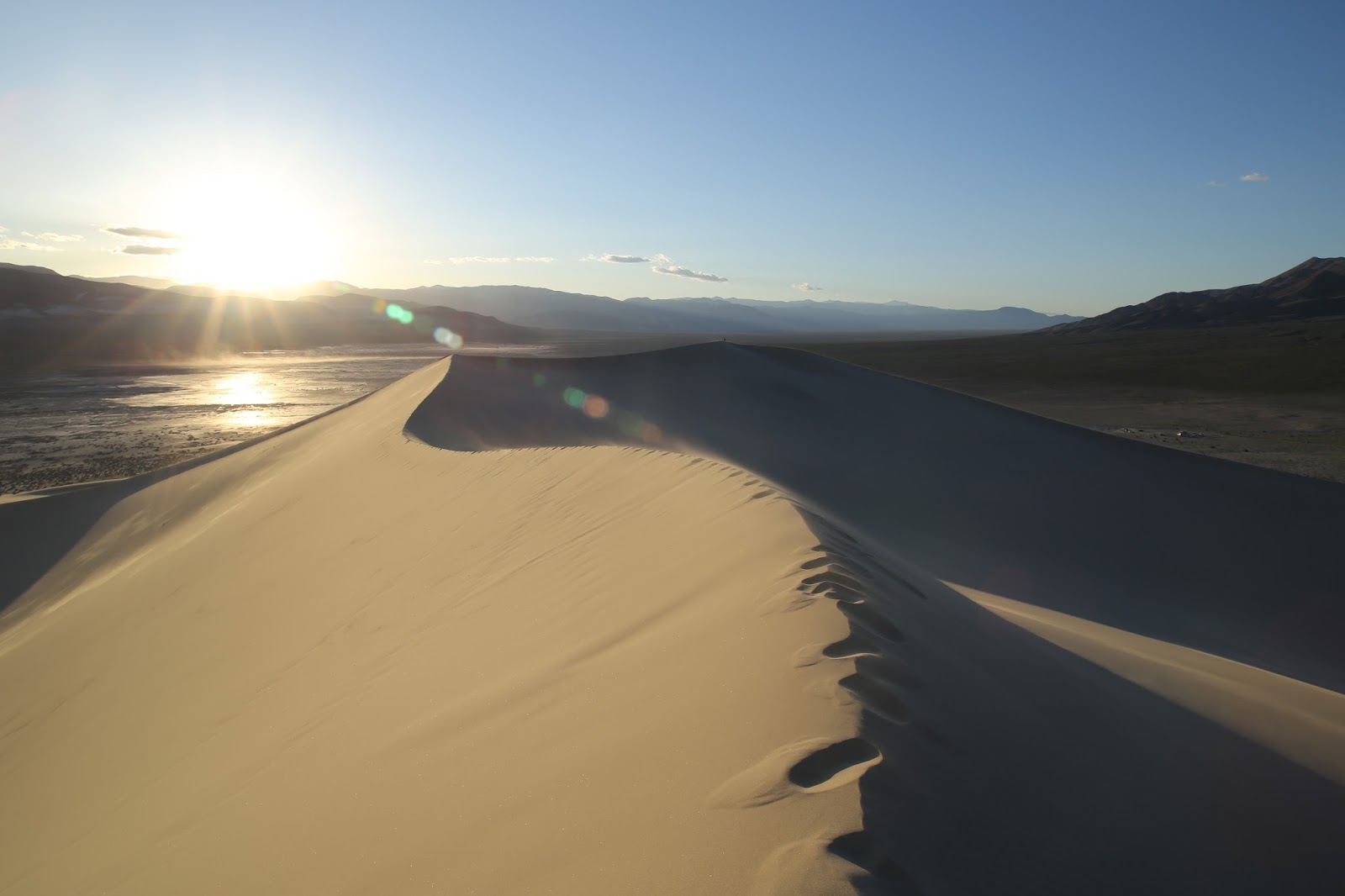 Eureka Dunes are actually the tallest sand dunes in California, boasting a beautiful view of the Last Chance Mountains, singing sands and several species of desert life endemic to this particular place. Right from camp one can wander out into this amazing backyard to climb those massive hills of sand, run down barefoot tumbling ’round, bask in the fading desert sun, watch sand beetles burrow in and wildflowers open for the nectar gatherers of the nocturnal sort.