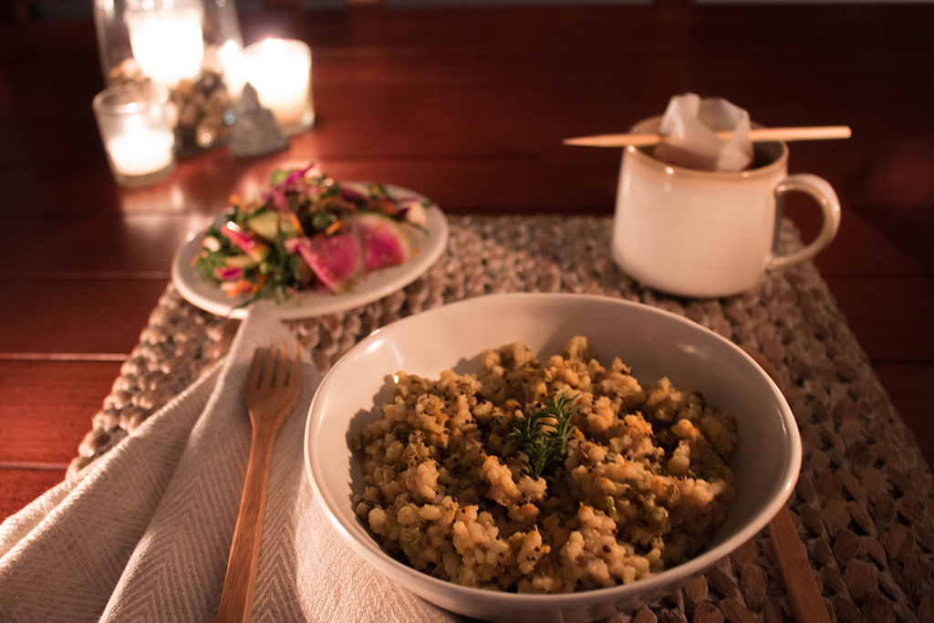 The recipe in this book says to soak the rice and beans overnight, but I have a tendency to take shortcuts in cases like these. After a throughout rinsing, I put the mixture in a bowl, covered it with boiling water and let is soak for a couple of hours. I am not sure if it’s a “proper” way of preparation, but I am never a stickler for those things. The spices are simple, yet provide a delicious flavor. Fresh ginger, turmeric, black mustard and cumin seeds. A cinnamon stick, some dried seaweed (kelp or kombu) is all you need to flavor this simple cleansing dish. I did add a few cloves of freshly minced garlic, just because everything is better with garlic. If this type of meal appeals to you, I highly recommend this book. It’s lovely, it’s motivating and it is definitely inspiring.
