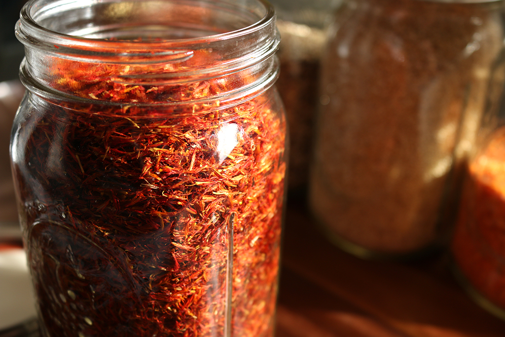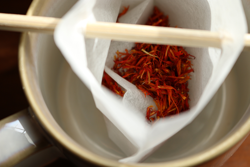 My husband has been into this sweet saffron tea lately, so it occupies some prime property on the countertop. I love the pop of color it adds to my jar decor. Its flavor is mellow and sweet and saffron tea is supposed to have many health benefits. It is said that it is good for the colon and aids digestion, so it seems a practical choice for our gentle cleansing efforts. Just boil some water, pour it over a teaspoon of dry tea and let it steep.