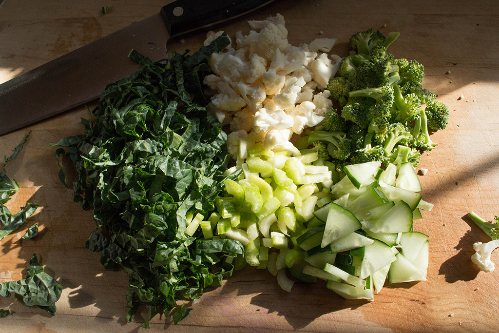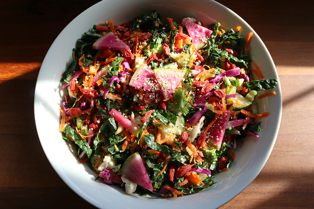 With a glass of this glorious liquid vibrancy revitalizing your system and a big bunch of fresh vegetables washed and ready to go, I’d say the first order of business is to create a detoxifying raw veggie salad to have on hand for some light lunches and healthy snacking over the next few days. I don’t believe you need a recipe to create a mean, clean, detoxin’ machine. Raw cruciferous vegetables are great detoxifiers and there are so many to choose from. Kale, cabbage and cauliflower. Broccoli, beets and brussels sprouts. And radishes…who knew radishes came in so many colors? Black, white, purple and red (not to mention, the watermelon ones), take your pick! Select yourself a variety of purifying cruciferous, chop ’em, toss ’em and top ’em with whatever superfoods suit your fancy and you suddenly find yourself making your way back to those healthy habits.