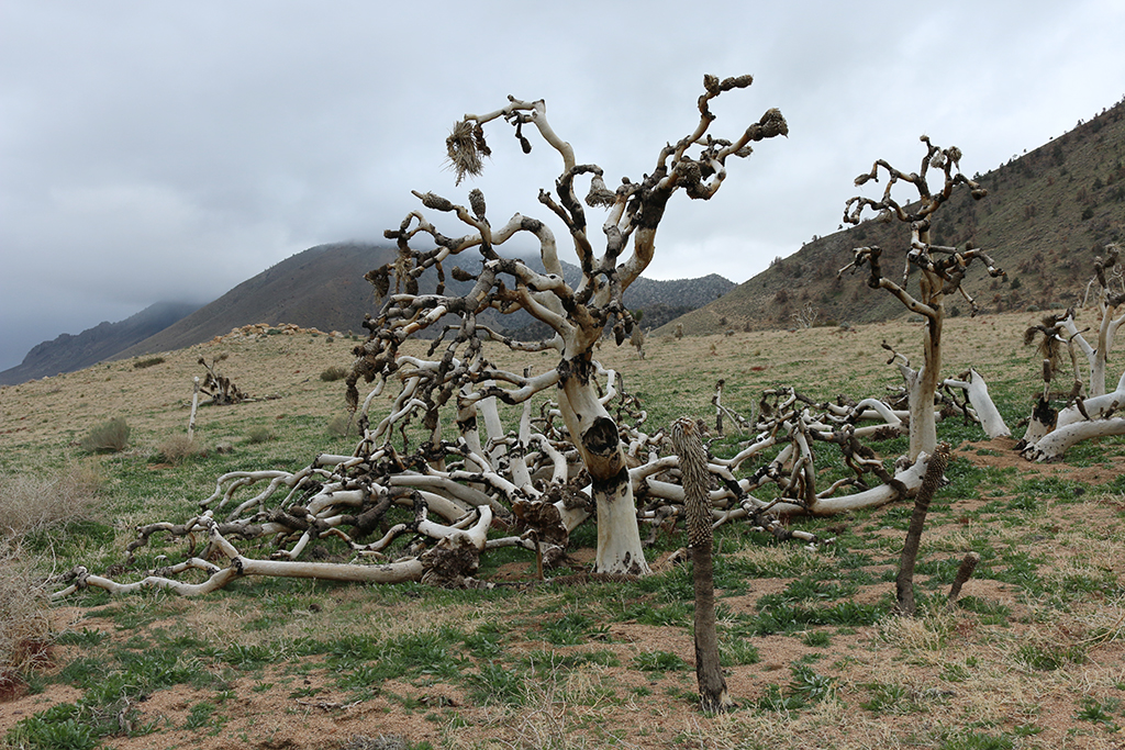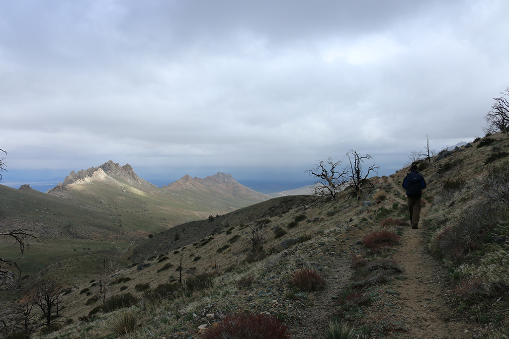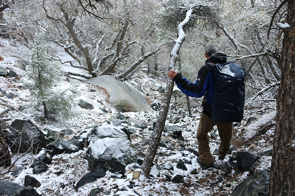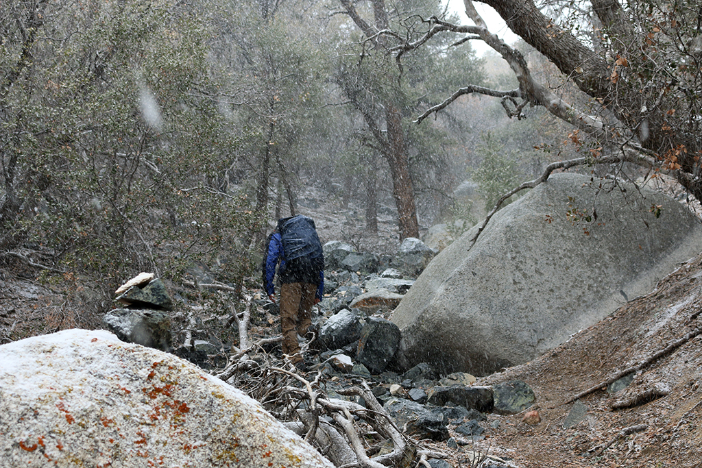 With the work week coming to end, Evan and I were looking forward to getting out for a nice little hike. We wanted to stay local and close to home, so we planned to hike nearby Owens Peak. It’s been years since I’ve been up there and I remember it being a fun jaunt. It is short and sweet…but pretty darn steep (unfortunately, I had forgotten about that part). Sometimes I really enjoy a simple, local hike, with a leisurely start to the day, a short drive, plenty of time and no need to rush. We slept in, concocted our respective breakfast bowls and went about our individual puttering. Checking the weather forecast we began to wonder about the rain…maybe we should hike a little closer and keep the elevation lower? I’m not usually the one to say: Hey, it’ll be okay. What’s a little rain? Let’s just go for it…but for some reason I did. I guess I was experiencing an unusually adventurous moment. We headed up into Indian Wells Canyon toward the trailhead for Owens Peak. It was a little further back than I remembered, a little higher up than I thought and it was beginning to look like it might snow. And sure enough, just as we parked the car, a light little snow flurry began to fall.