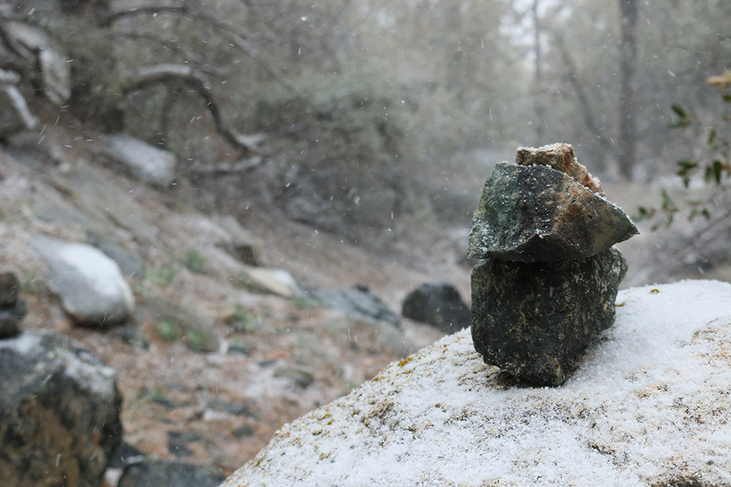 Though I was enjoying the winter weather and the spirit of the moment, it slowly began to dawn on me that this trail was steeper than I remembered. And there were lots of rocks. And they were slippery in the snow. And there was that one section up a little higher that suddenly didn’t sound like fun. But we walked a little longer, hiked a little higher, until the not-so-adventurous one among us cried “uncle”. Undoubtedly, we could have made it to the summit, had I personally been in the mood to brave the storm. But I really just wanted to have fun. Ah well, you do what you do, enjoy what you can and find the beauty in every situation.