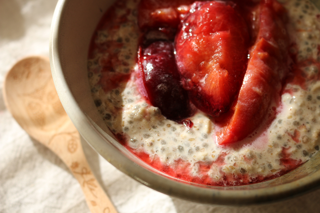 Oh, what a mess! I was so sad to see all that perfect milk go to waste. Well, no use crying over spilt milk, I suppose. Once I mopped up that precious bit of lost milk, I stepped back to admire my creation and instantly began pondering the many tasty ways in which I could use it. Glancing at a bowl of organic summer stone fruits sitting idly nearby, I’m pretty sure I heard the peaches scream, Helloooo, lady! Peaches and cream?! I got one of those random, I-don’t-know-where-it-came-from ideas and I roasted a pan of peaches and plums. This milk is somewhat thick, like the consistency of cream and not watery like many nut milks can be. I think it lends itself well to things like a creamy latte or a simple bowl of fruit and cream. After allowing them to slightly cool, I drenched a few in this perfectly suited hemp milk and drizzled a tiny bit of honey on top. Dessert for breakfast…who doesn’t love that?