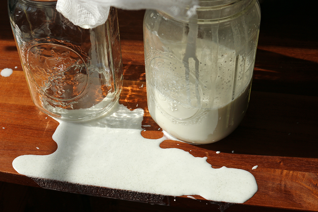 *I thought it would be a great idea to strain my milk directly into the narrow opening of a quart-sized storage jar. I propped up the strainer, positioned it just so and I was delighted with my strategy to avoid dirtying yet another bowl…until I turned away for just a moment. Not so brilliant strategy. Just