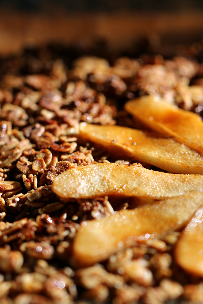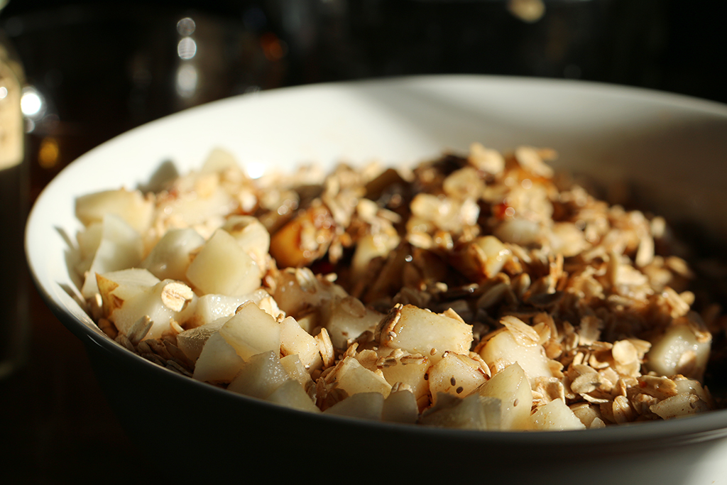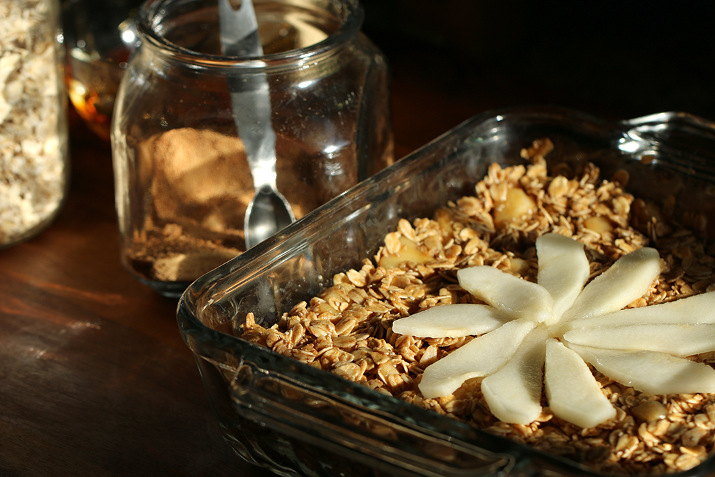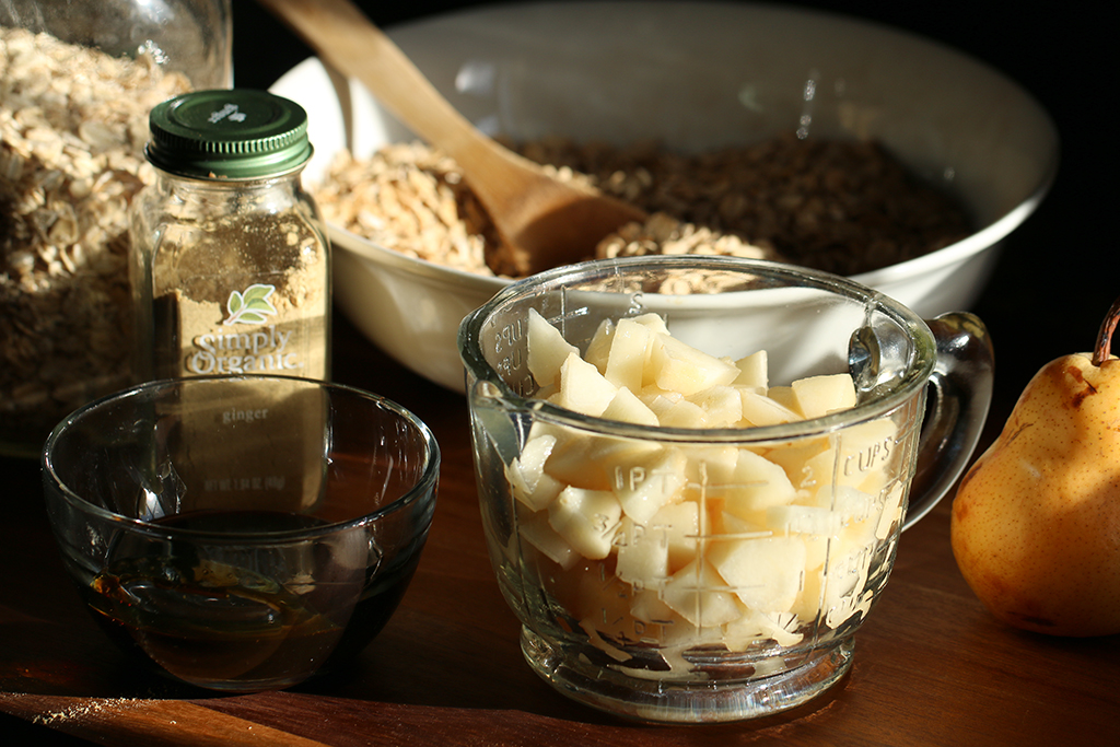 Still suffering the ill-effects of the kindergarten classroom chaos and my Christmas cookie coma, I was desiring something healthy to eat. How about oatmeal…that tastes like gingerbread…with pears…and baked to sort of resemble that Christmas morning bread pudding. Well, it wasn’t like my mom’s bread pudding at all, but it was warm and comforting. Really, it was just a pan of oatmeal, but adding a little molasses and ginger, filled the kitchen with Christmas flavor and effectively summoned the spirit of the season.