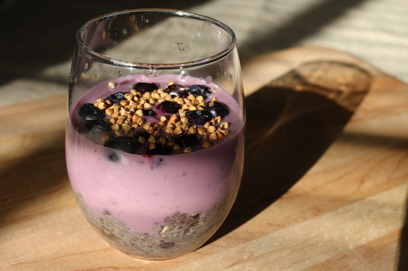 The strawberries may have taken the title, as far as fermenting goes, but the blueberries and ginger maintain a very strong bond and tend to reappear often in a few other favorites. Like the Blueberry-Ginger Chia Pudding and Yogurt Parfait. Isn’t that a fancy title! This simple, chia seed pudding is a superfood staple. It is nutrient-dense, gut-friendly, so open to customization and you can flavor it with just about anything. I like the superberry version (simple, with dried goji berries, golden berries and mulberries), the mango-coconut and the chai-spice…all very tasty favorites. But then I invited the maqui berry…and the the ginger…and the blueberry yogurt…and, at the last minute, the buckwheat crunchies…and the gang fancied up the whole affair to the point of no-going-back. Simple is now spoiled and I will forever be a chia seed snob.