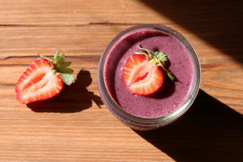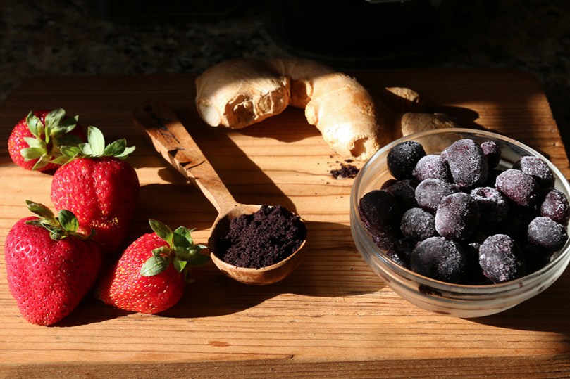 This latte is a nice, soothing treat at the end of the day and a delicious way to incorporate some of those healthy supplements into your diet. However, when it’s 110 degrees out and the summer heat just won’t let up, the last thing I want is a hot cup of anything. With some frozen berries and a handful of ice you can easily get those supplements along with the cooling effects of a nice, cold smoothie. In this berry-ginger smoothie, the strawberries and the blueberries join forces with the maqui and the acai to up the antioxidant level even more.